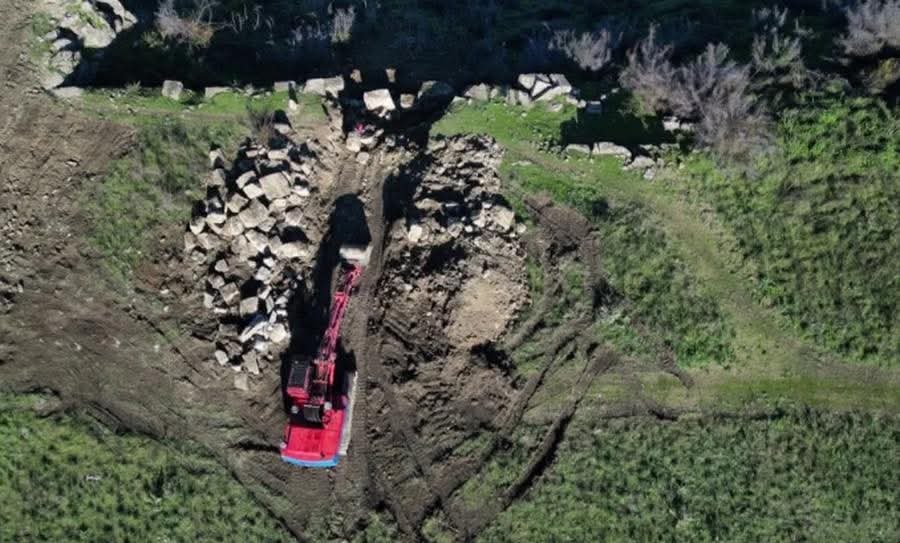 2. Foto 2 dhe 3. Germime me buldozer ne Akropol nga fshataret e zones per llogari te nje Firme pa asnje eksperience ne rindertimin e Mureve Antike e cila ka fituar tenderin e Ministrise se Kultures dhe Miratimin e “rrobaqepesve” te IKTK