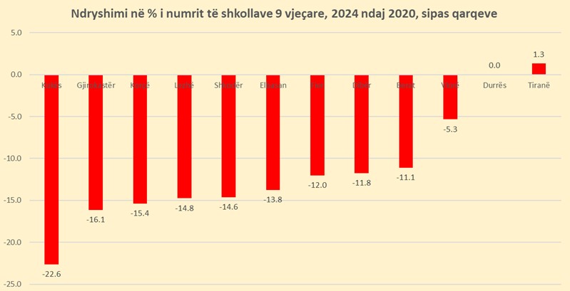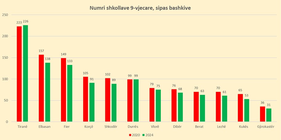 Tendenca është më e theksuar gjithashtu në qarqet Lezhës, Shkodrës dhe Elbasanit me tkurrje rreth 14%. Në anën tjetër, Tirana mbetet zona më e qëndrueshme, ku numri i shkollave në ciklin 9- vjeçar është shtuar me tre nga 2020 në 2024, duke reflektuar rritjen demografike dhe përqendrimin e popullsisë në kryeqytet. Edhe Vlora ka një përqindje të ulët, me 5.3% mbyllje, ndërsa Durrësi kishte të njëjtin numër shkollash në 2024 si në 2020. Gjatë periudhës 2020–2024 numri nxënësve në arsimin 9 vjeçar ka rënë me 36.8 mijë nxënës ose -14.2%.