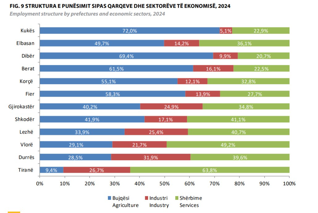 Në 6 qarqe të vendit, Kukës, Elbasan, Dibër, Berat dhe Korçë bujqësia kontribuon në më shumë se gjysmën e punësimit, teksa sektorët e tjerë të industrisë dhe shërbimeve zënë një peshë shumë të vogël.