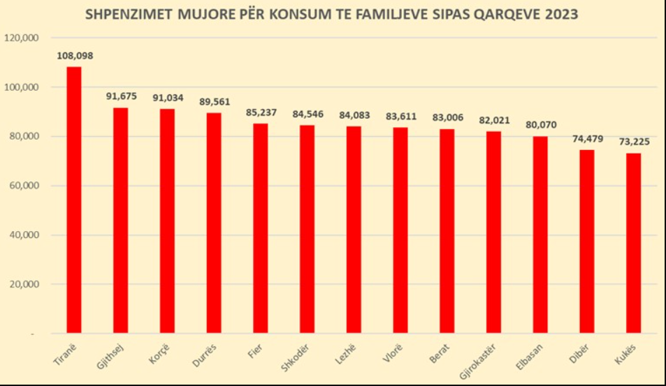 Teksa Kukësi ka shkallën më të lartë punësimit, vjen në fund të renditjes nga 12 qarqet e tjera për shpenzimet mujore të familjeve. Në vitin 2023, një familje në Kukës shpenzonte 73,225 lekë në muaj sipas INSTAT, niveli më i ulët në rang vendi dhe 20 për qind më pak se mesatarja kombëtare.